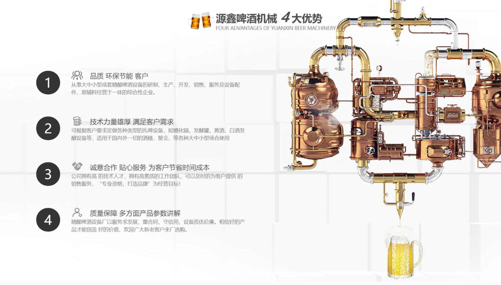 南陽(yáng)市源鑫啤酒機(jī)械設(shè)備有限公司位于歷史文化名城一-南陽(yáng),從事大中小型成套啤酒、白酒自釀設(shè)備的研制、生產(chǎn)、開(kāi)發(fā)、銷(xiāo)售、服務(wù)及設(shè)備配件、原輔料經(jīng)營(yíng)于一體的綜合性企業(yè)。公司可根據(jù)客戶要求定做各種類型的扎啤設(shè)備,如糖化鍋,發(fā)酵罐,黃酒、白酒發(fā)酵設(shè)備等,適用于國(guó)內(nèi)外一切的酒樓、餐廳、家庭.聚會(huì)、酒吧等各種大、中、小型場(chǎng)合使用。公司擁有技術(shù)人才,擁有高素質(zhì)的工作團(tuán)隊(duì),可以及時(shí)的為客戶提供**的銷(xiāo)售服務(wù)。公司以“專業(yè)資格,打造品牌”為經(jīng)營(yíng)目標(biāo),“卓越質(zhì)量,信賴價(jià)格”為經(jīng)營(yíng)宗旨,以質(zhì)量求生存,以服務(wù)求發(fā)展,重合同、守信用,設(shè)備質(zhì)優(yōu)價(jià)廉。相信好的產(chǎn)品才能創(chuàng)造 好的價(jià)值,歡迎廣大新老客戶來(lái)廠選購(gòu)。...